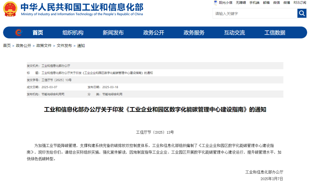 为加强工业节能降碳管理,支撑构建系统完备的碳排放双控制度体系,工业和信息化部组织编制了《工业企业和园区数字化能碳管理中心建设指南》,现印发给你们。请结合实际组织实施,强化宣传解读,因地制宜指导工业企业、工业园区开展数字化能碳管理中心建设运行,提升碳管理水平,加快绿色低碳转型。