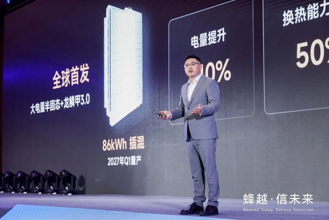 在半固态技术与龙鳞甲3.0的共同加持下,蜂巢能源本次发布两款产品,包括86kWh插混电池,以及115kWh纯电电池,电量提升10%以上,换热能力提升50%,10%-80%电量峰值6C充电只需10分钟,且实现高温热失控不蔓延。