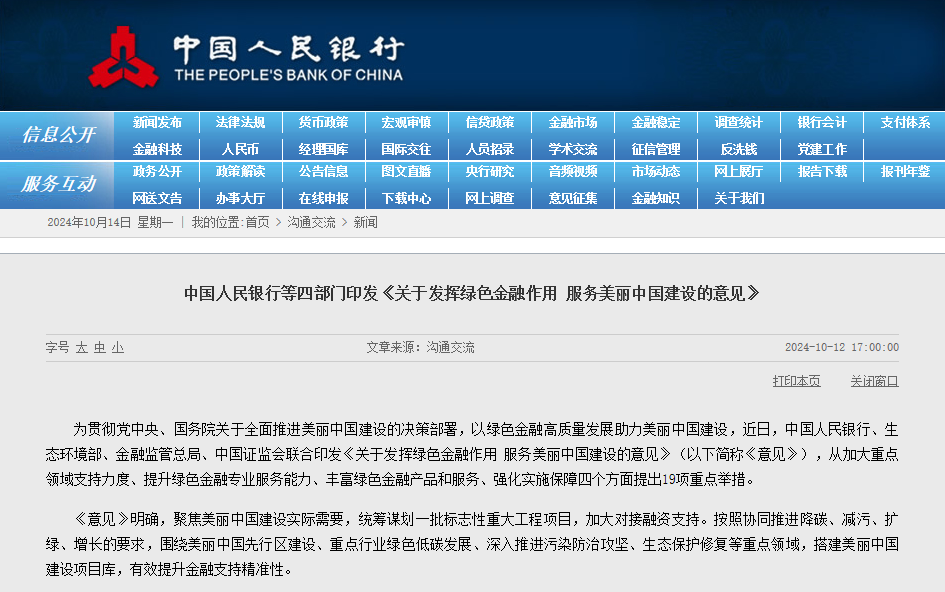 2024年10月12日,中国人民银行、生态环境部、金融监管总局、中国证监会联合印发《关于发挥绿色金融作用 服务美丽中国建设的意见》(以下简称《意见》),从加大重点领域支持力度、提升绿色金融专业服务能力、丰富绿色金融产品和服务、强化实施保障四个方面提出19项重点举措。